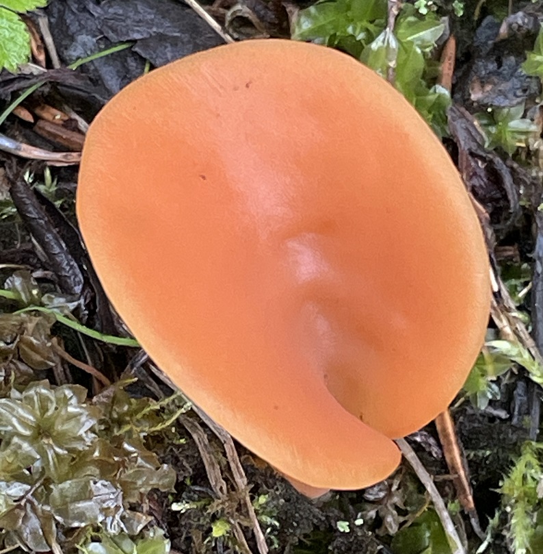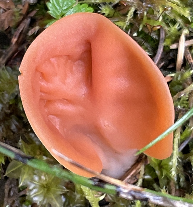 子实体一般较小,胶质,匙形或近漏斗状,柄部半开裂呈管状,高3~8cm,宽2~6cm,浅土红色或橙褐红色,内侧表面被白色粉末。