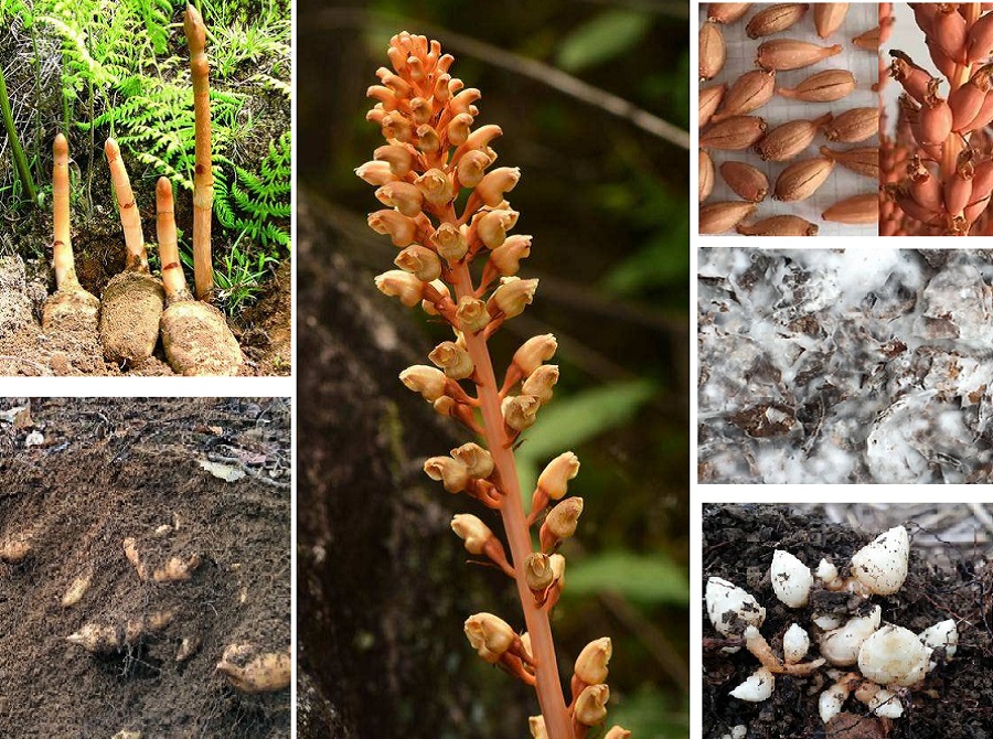 天麻是一种无根无叶的特殊植物,前半生都生活在土中,没有自养能力。在萌发菌的帮助下,天麻种子萌发形成原球茎,接下来它们就依靠蜜环菌的菌丝提供营养进行生长生,直至生理成熟,它才抽苔开花结果。可见天麻的一身都依靠着蘑菇。