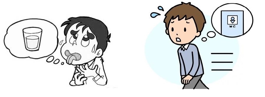 口干舌燥或者多诞(口水很多);出汗;无尿、少尿;也有尿频、甚至血尿。
