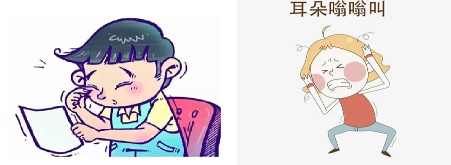 眼睛流泪、瞳孔缩小、视力模糊,视觉畸变;耳鸣。