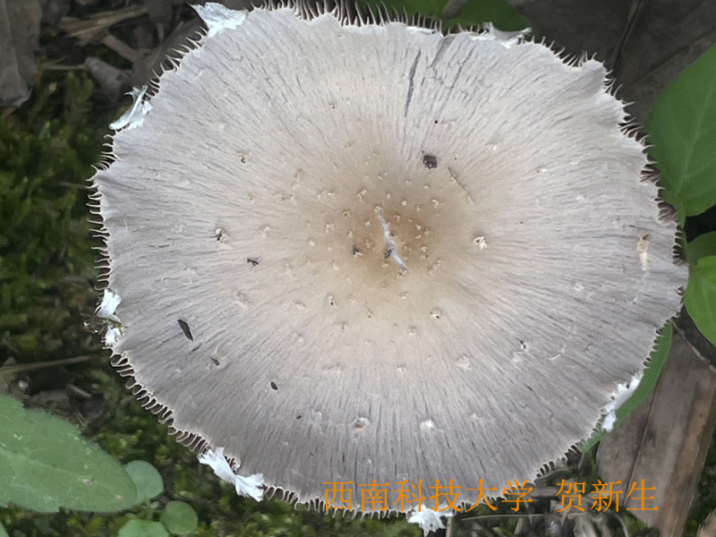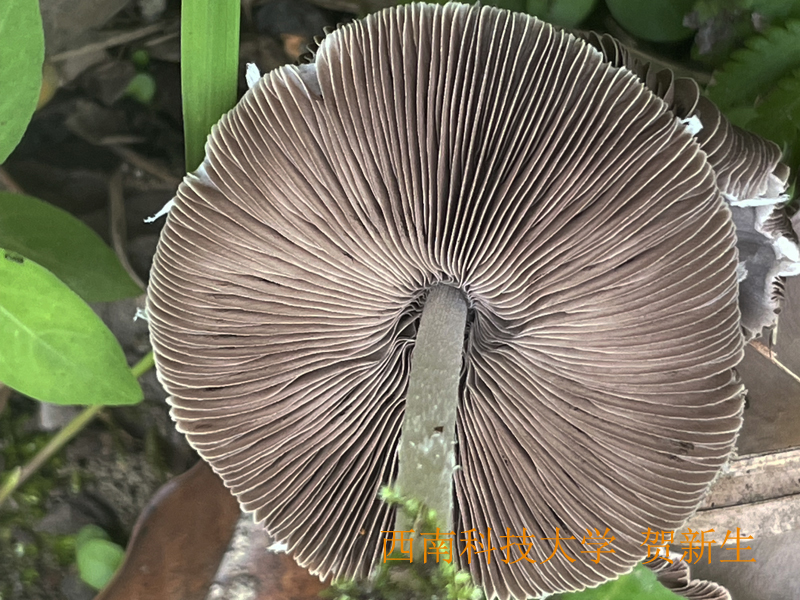 菌褶污白、灰白至褐紫灰色,直生,较窄,密,褶缘污白粗糙,不等长。