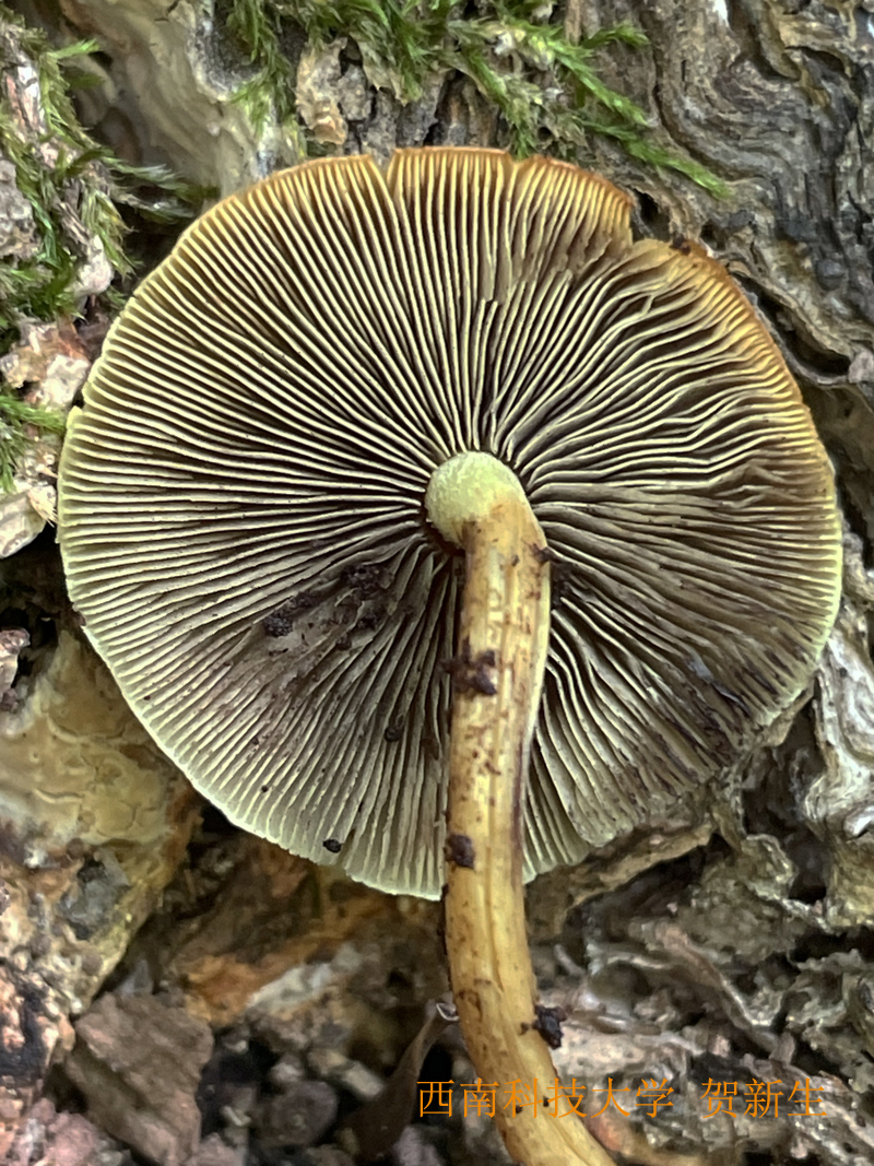 菌柄黄色而下部褐黄色,纤维质,长可达12cm,粗可达1cm,表面附纤毛,内部实心至松软。