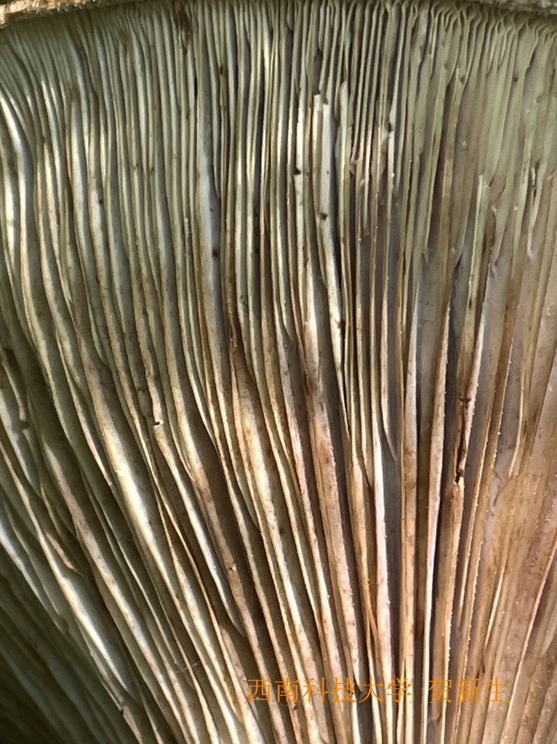 菌褶白色或近白色,中等密,不等长,近延生,褶缘常带淡绿色。