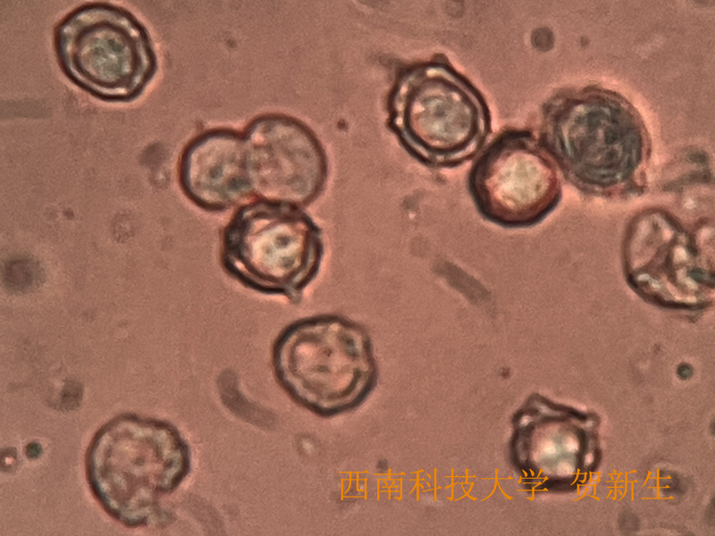 孢子印白色。孢子无色,近球形,小刺显著,稍有网纹,7.6~10.6(-12.8)μmx6.9~8.8(-10.5)μm。