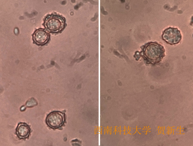 孢子无色,近球形,有明显小刺及棱纹,7.5~12.5μm。